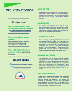Please keep in mind that being a mentor is a tremendous step and can be the foundation for a relationship that can lead to a real difference in one’s life. Many “at risk” youth, such as those at Commonwealth ChalleNGe, have at one time or another, found it difficult to trust or count on an adult; many have an innate sense of anxiety and uncertainty.